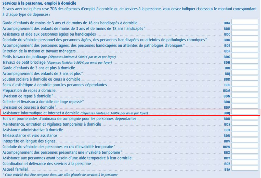 • Remplir : Assistance informatique et internet à domicile case n°BDQ